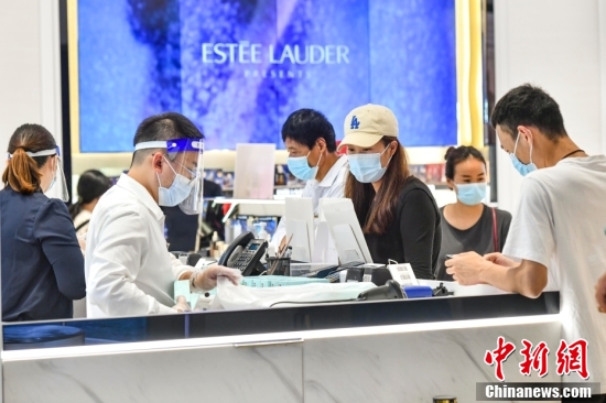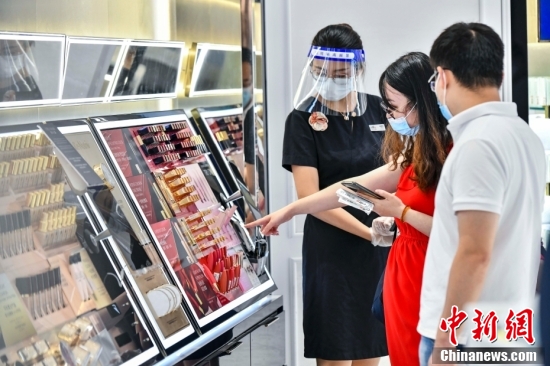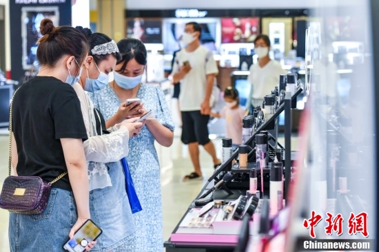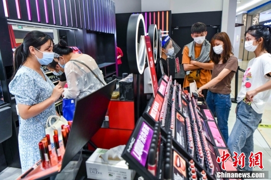 顾客在中免集团海口日月广场免税店选购化妆品。 (中新社记者 骆云飞 摄)