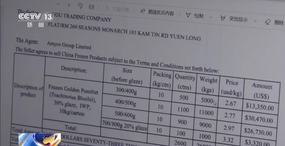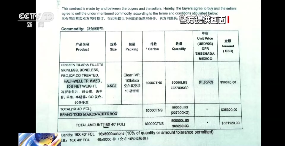 湛江海关缉私局茂名分局四级高级警长李忠:你看它合同的编号,商品的品名、规格、型号和重量都是一样的,只是单价差别很大,真正的销售成交价格是每公斤是1.8美元,而虚假的合同上销售价格是4.92美元,这个高报的幅度超过了200%。