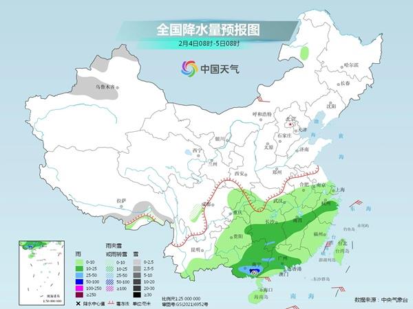 明天,新疆北疆北部、西藏东南部等地部分地区有小雪。江南北部和西南部、华南等地的部分地区有中到大雨,其中,广西东南部等地局地有暴雨。