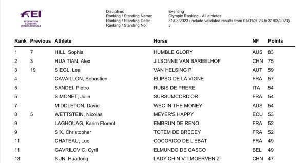 2023年4月初,国际马联更新三项赛个人奥运资格积分排名,中国骑手华天和巧克力(JILSONNE VAN BAREELHOF)目前以75个积分排名全球第二。中国骑手孙华东和淑女(LADY CHIN V'T MOERVEN Z)以47个积分排在总榜单第13位。中国骑手包英凤和FLANDIA 2排在总榜单第81位,华天和另一匹战马骐骥(CHICKO,又名三哥)也榜上有名。