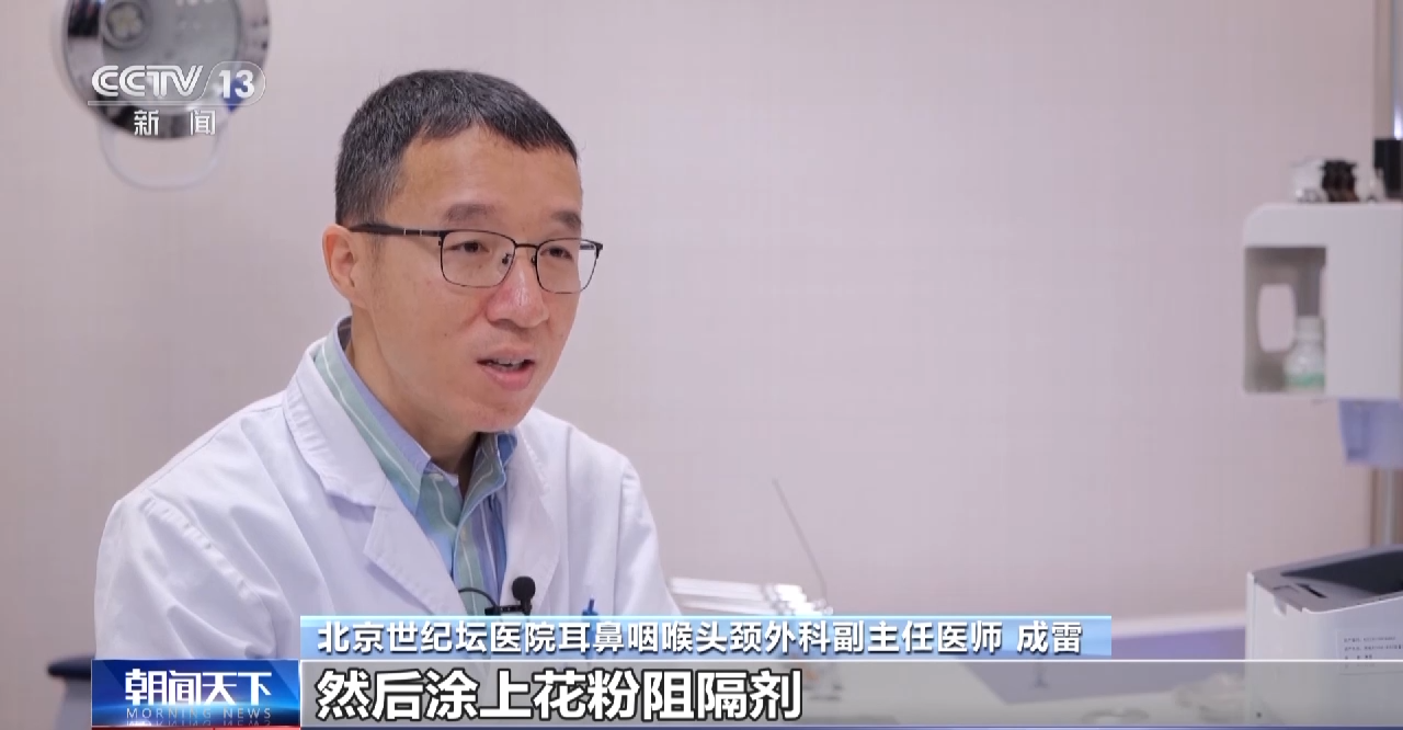 北京世纪坛医院耳鼻咽喉头颈外科副主任医师 成雷:外出之前,在鼻腔先喷上鼻喷激素,然后涂上花粉阻隔剂,再戴上防花粉的口罩,眼睛如果过敏,滴一些防过敏的眼药水,戴上一个面屏。一定不要用手去触摸鼻子、揉眼睛,回到室内的时候,一定要先洗手,可以用生理盐水进行鼻腔冲洗。