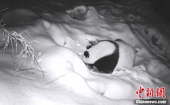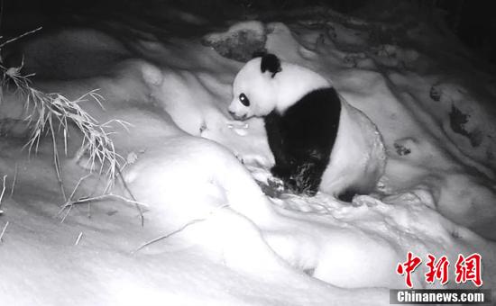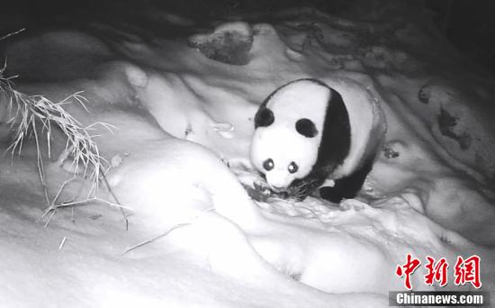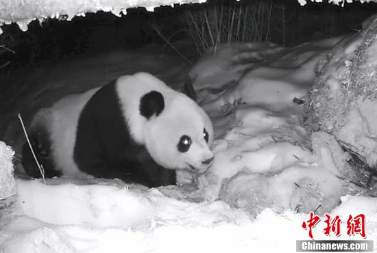 近日,大熊猫国家公园四川平武王朗片区工作人员在回收野外红外线相机时,发现几段野生大熊猫在雪地中找水喝的珍贵影像。图为野生大熊猫在雪地中找水喝。