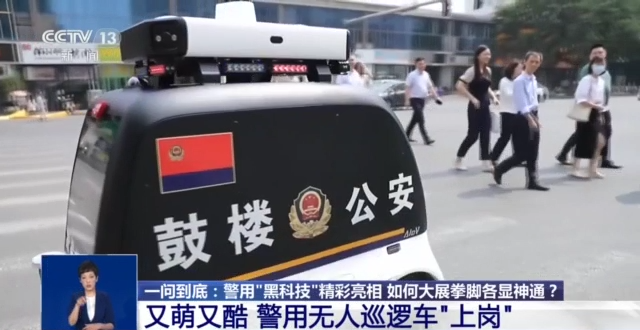 那么还有哪些科技警力已经投入使用了呢?先来看看帮助治安民警巡逻的无人巡逻车。这辆警用无人巡逻车长1.75米,总重量300公斤,在满电量情况下可以自动巡逻6至8小时。无人巡逻车上有8个摄像头,可以保证360度无死角进行视频录像,实时把录像传送到警方指挥中心。它的四周是感知雷达,上面是激光雷达,有自动避障功能,遇到障碍物会自动停下来。民警只需要设定好巡逻路线,这辆无人巡逻车就可以实现自动上路巡逻。