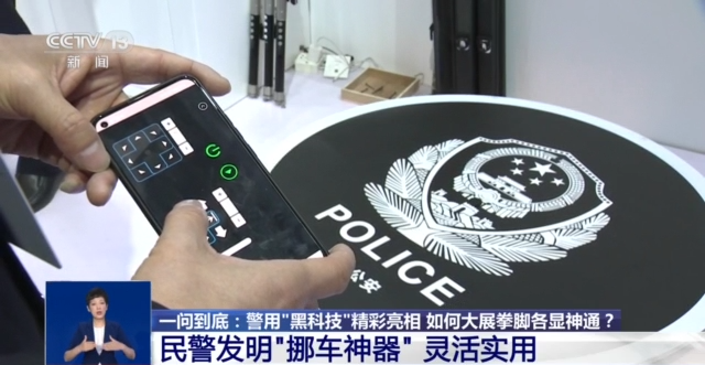 其实在警用装备科技化的过程中,还有很多民警发明创造的装备,比如这款“挪车神器”。它的大名叫多功能升降式搬运机器人,非常灵活有力,通过手机操纵就能实现旋转、升降、行驶等功能,能有效清除路面故障,移走违停、故障车辆,在现代交通管理中非常实用。