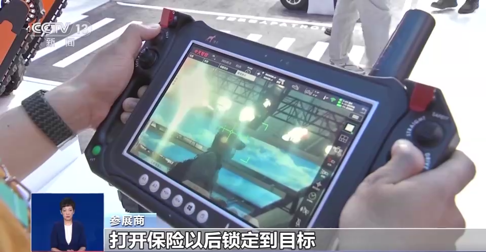 参展商:咱们锁定目标以后,目标动,我的车也会动,相当于是一个动态的跟踪。打开保险以后锁定到目标,两个按钮同时按是一个激发,可以看到这个弹药数已经从10变成9,说明我有一发子弹已经打出去了。这边这个蓝色按钮,按下是激发咱们的一个非致命性武器,比如说它可以内置咱们公安内部的一个橡胶弹,或者是电击枪、强光手链,对目标实现一个致盲的功能。