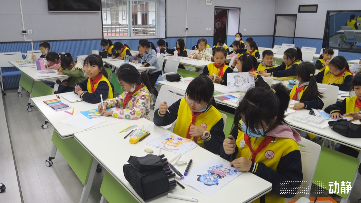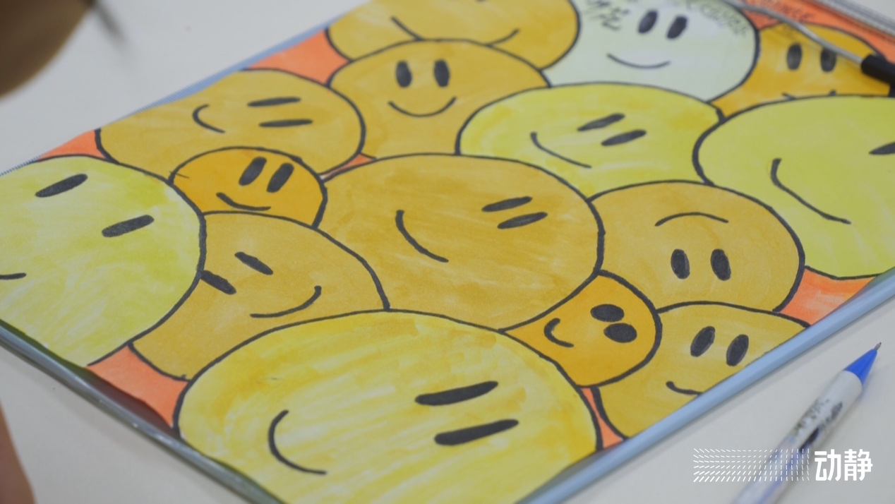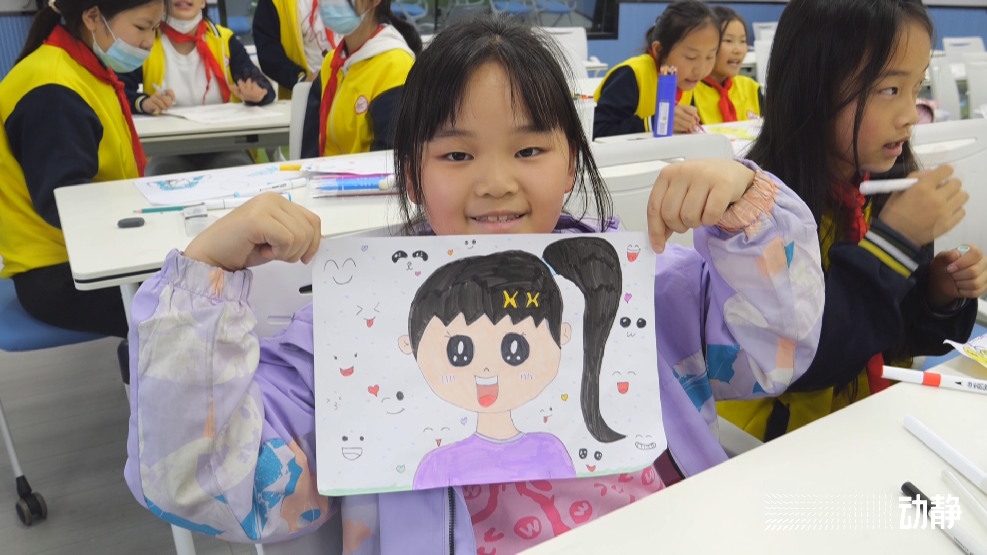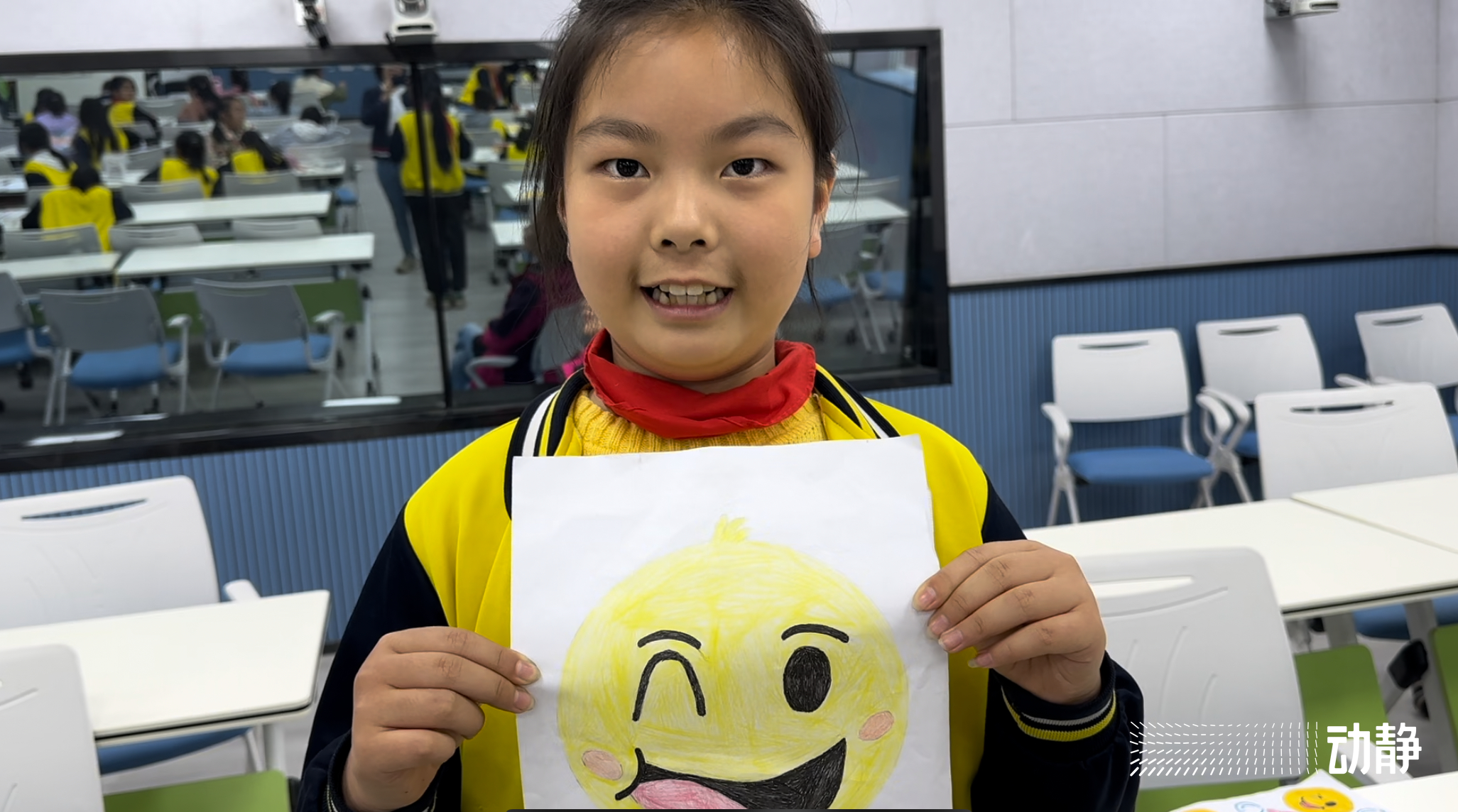 下午两点半,在贵溪路小学的录播教室,同学们正在进行微笑创意比赛。四年级一班的杨张馨淼同学说:“我画的是一个表情包,希望通过表情包祝大家每天开开心心,通过乐观和微笑面对生活中的困难。”