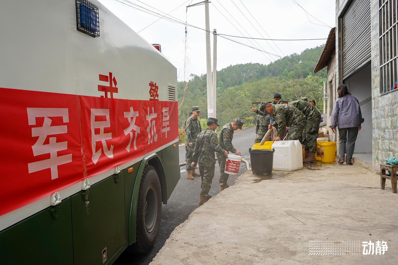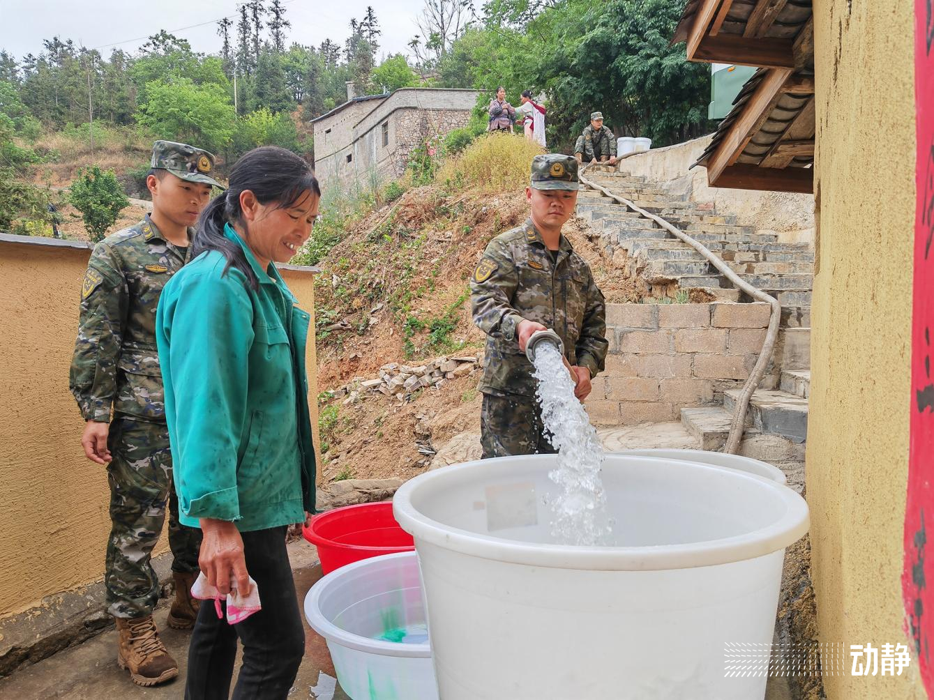 “来水啦!”看着武警官兵送来的水,黔西南州兴义市乌沙镇普梯村村民们高兴坏了。