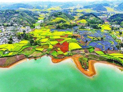 3月24日,贵州省黔西市绿化白族彝族乡,千亩李子花、万亩油菜花,蔬菜大棚,蓝天白云映衬下的村庄,与湖泊、高速路构成一幅秀美的新农村画卷。周训超摄 光明图片