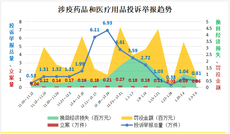 “二十条”和“新十条”出台后,疫情防控重心从防控感染转到医疗救治,2022年11月10日至2022年底,全国12315平台接收相关投诉举报24.11万件,同比增长3.88倍,环比增长2.95倍,最高峰值达到19.5倍。其中,投诉14.18万件,举报9.93万件,挽回经济损失498.17万元。
