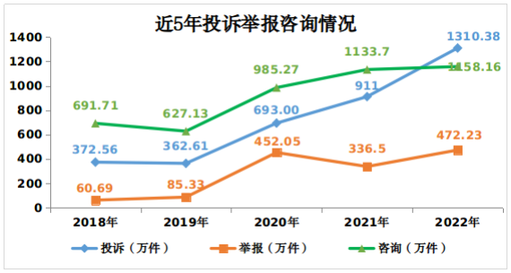 消费者积极发挥社会监督作用,2022年全年向市场监管部门举报各类违法线索472.23万件,同比增长40.34%。