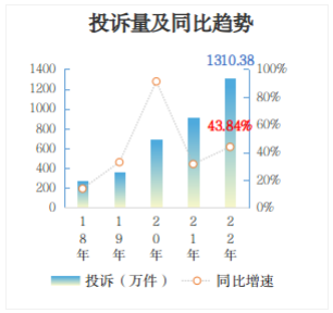 2022年,全国市场监管部门受理消费者投诉1310.38万件,同比增长43.84%,增速较2021年有所放大。其中,售后服务问题增长最快,群众反映最强烈,同比增长57.67%。消费者诉求主要集中在不退款、不发货、不履行“三包”承诺、不落实七天无理由退货义务、送货不及时等方面。