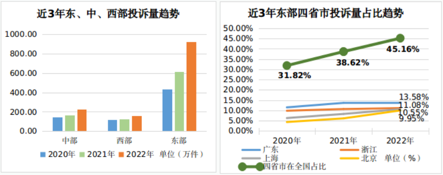 从近三年趋势看,广东、浙江、上海、北京4个省市的消费正在加速集聚。消费投诉数量与消费活跃水平呈正相关关系,四省市消费投诉数量在全国的占比从2020年的31.8%增长到2022年的45.16%。