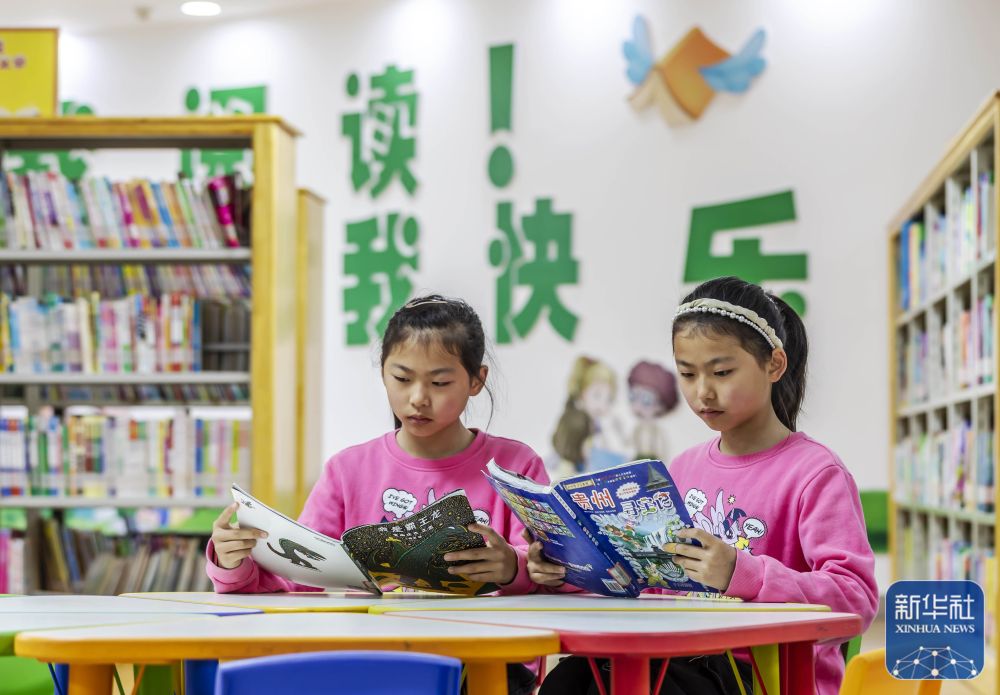 4月1日,一对孪生姐妹在贵州省黔西市图书馆少儿阅览室阅读图书。新华社发(范晖 摄)
