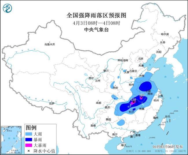 预计,4月3日08时至4日08时,湖北东部和南部、湖南北部、江西北部、安徽、河南东部、山东南部及陕西中部、山西中部、重庆北部、广西东北部等地有大到暴雨,其中,安徽中部、湖北东部、湖南北部等地部分地区有大暴雨(100~130毫米)。上述部分地区伴有短时强降水(最大小时降雨量20~50毫米,局地可超过60毫米),局地有雷暴大风等强对流天气。内蒙古中部的部分地区有大到暴雪,局地大暴雪。