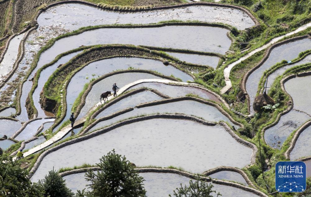 4月26日,在贵州省黔东南苗族侗族自治州从江县加榜乡党扭村,农民牵着耕牛走在梯田上。新华社发(罗京来摄)