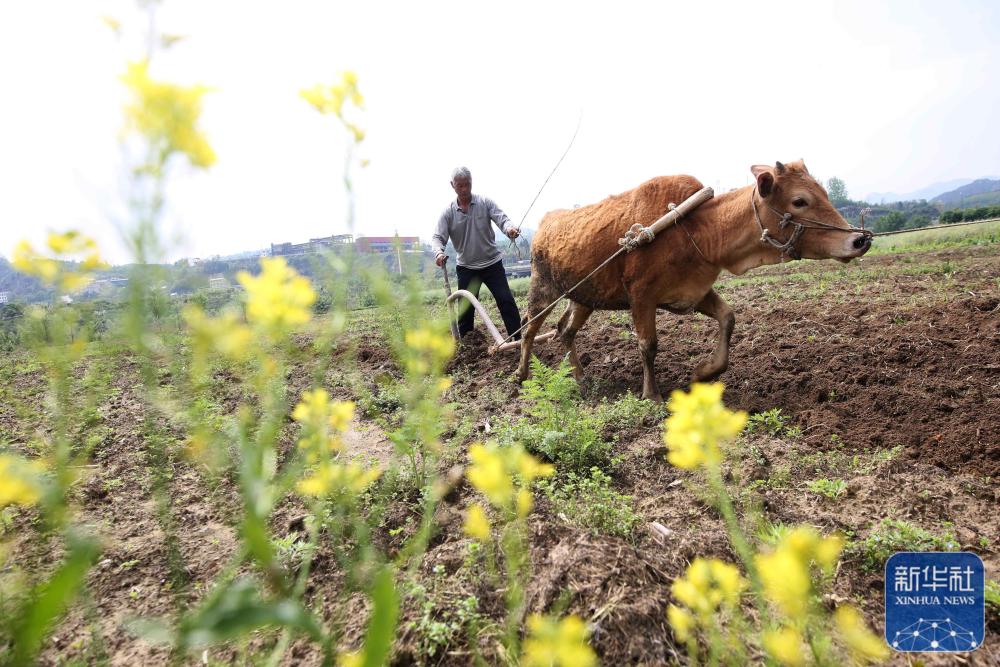 4月26日,农民在贵州省铜仁市玉屏侗族自治县皂角坪街道茅坪村赶牛犁地。新华社发(刘德军摄)