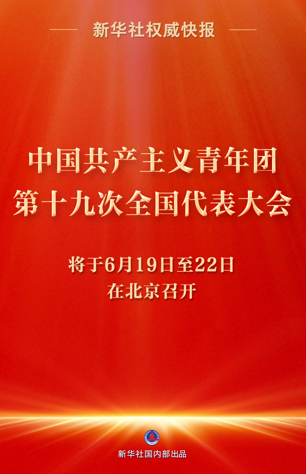 经党中央批准,中国共产主义青年团第十九次全国代表大会将于6月19日至22日在北京召开。目前,大会的各项筹备工作进展顺利。
