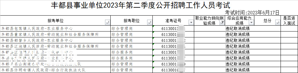 8月3日,丰都县人力资源和社会保障局第二次发布了“关于丰都县事业单位2023年第二季度公开招聘工作人员笔试成绩及进入面试人员名单的公示”。公示中,共有8名考生因违纪取消成绩。其中,前述7名130分以上考生的成绩一栏均标注为了“违纪取消成绩”;此外,还有1名职测分数27分、综应分数40分、总分67分的考生也被取消成绩。