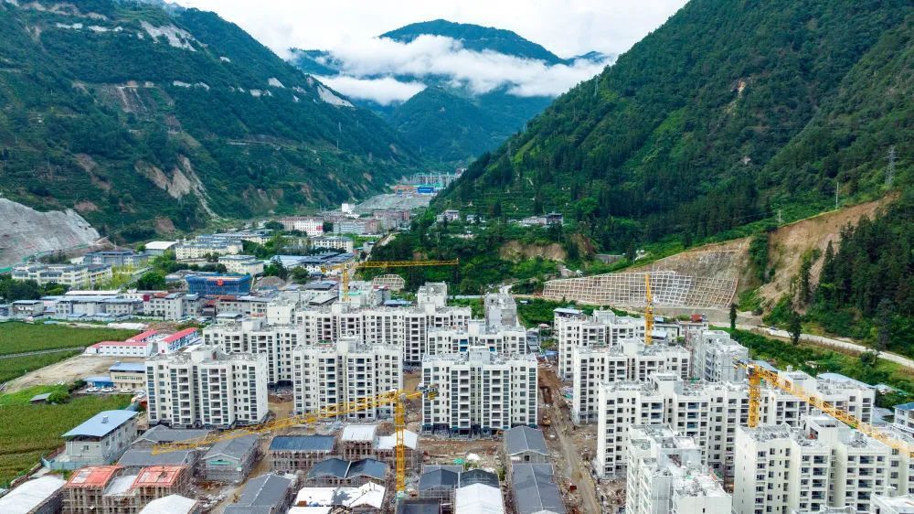 在石棉县王岗坪乡挖角集镇的重建项目现场,塔吊林立、机车轰鸣,该项目已完成主体建设,即将进入分房阶段。