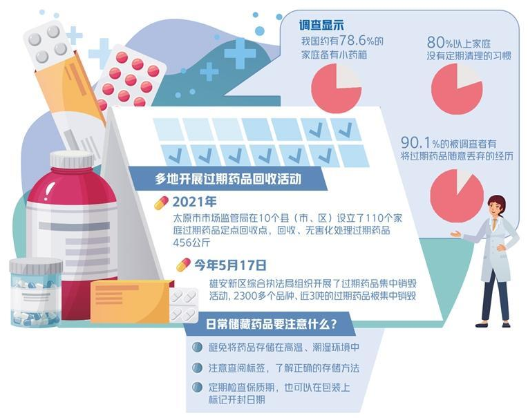 据广药集团广州白云山医药集团股份有限公司相关数据,我国约有78.6%的家庭备有小药箱,但80%以上家庭没有定期清理的习惯,90.1%的被调查者有将过期药品随意丢弃的经历。