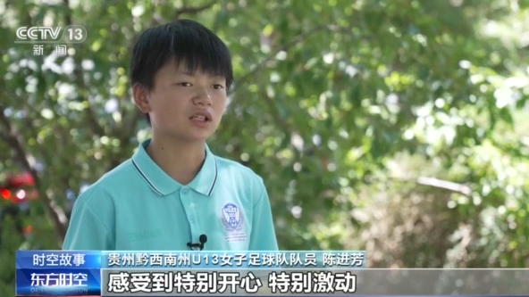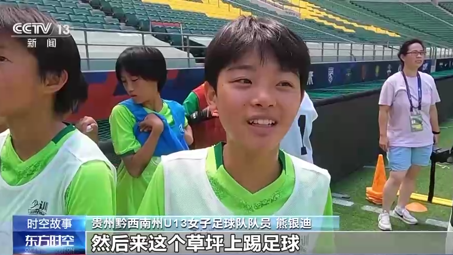 贵州黔西南州U13女子足球队队员 熊银迪:感觉这里的草坪跟我们那里不一样,梦想是当上国家队的一员,然后来这个草坪上踢足球。