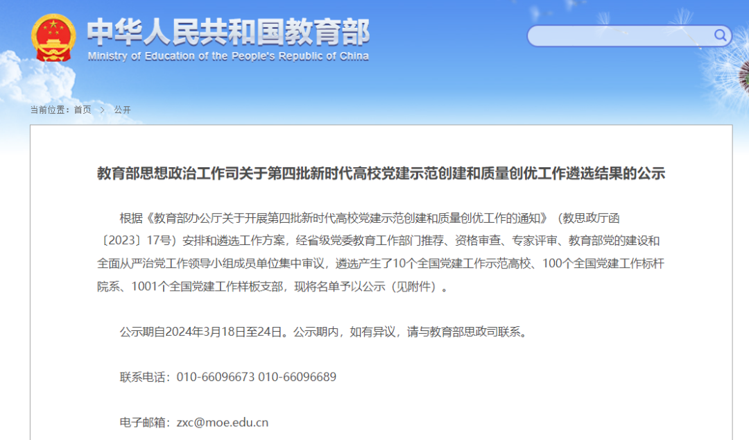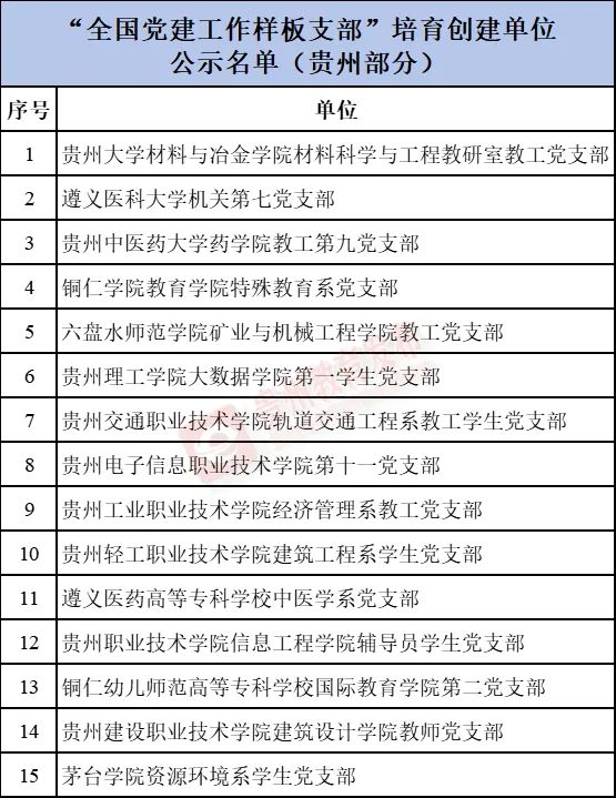 近日,教育部公示第四批新时代高校党建示范创建和质量创优工作遴选结果。贵州1所院系拟入选全国标杆院系,15个支部拟入选全国样板支部,公示期为2024年3月18日至24日。