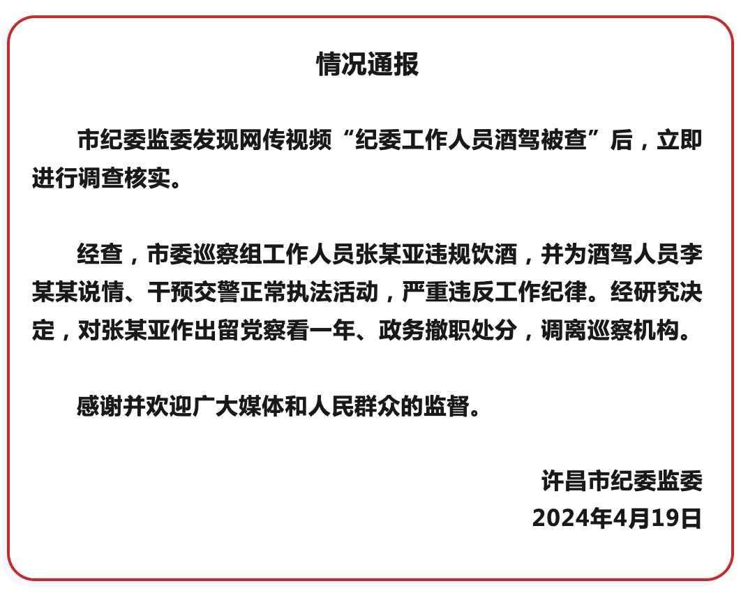 4月19日晚,河南省许昌市纪委监委发布情况通报: