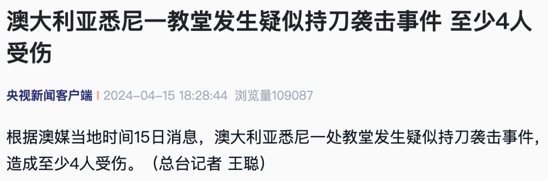 据央视援引澳媒当地时间4月15日消息,澳大利亚悉尼一处教堂发生疑似持刀袭击事件,造成至少4人受伤。