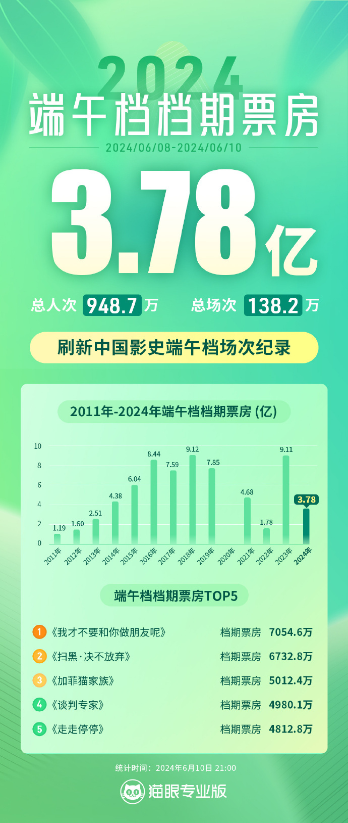 据猫眼专业版数据,截至6月10日21时,2024端午档总票房3.78亿,总场次138.2万,刷新中国影史端午档场次纪录,《我才不要和你做朋友呢》成端午档票房冠军。