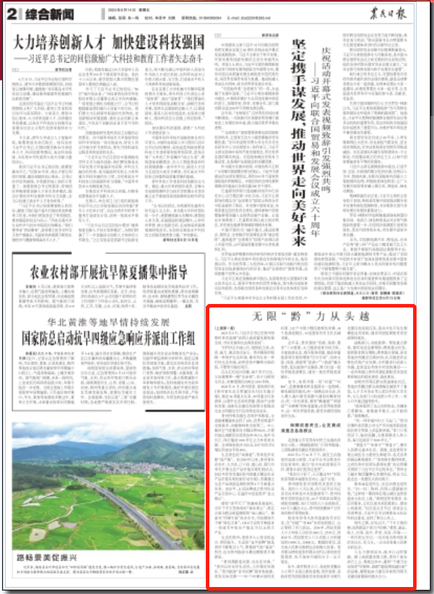 是发展奋进贵州:地区生产总值增速连续10年位居全国前列,经济总量突破2万亿元。黔贵大地,万桥飞架、大道纵横,“千沟万壑”蝶变为“高速平原”,“偏居一隅”转变为“西部通衢”;以“富矿精开”推动矿产资源大省的产业链不断延伸,以“东数西算”的算力、产业、赋能扬帆数字蓝海;加快建设“六大产业基地”,构建现代化产业体系;行走贵州,到处都是茶园、果园、花园,乡村处处看得见青山、望得见绿水、记得住乡愁。