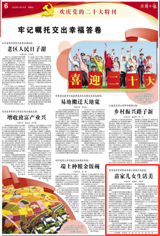在化屋村易地扶贫搬迁安置点的苗绣工坊里,27岁的苗族姑娘杨文丽正带着绣娘们飞针走线,一幅9米长的苗绣长卷即将完工——错落有致的民居掩映在青山绿水间,身着少数民族服饰的村民们载歌载舞,生动再现了化屋村10年来的巨大变化。“这是我们用苗族特有的方式记录村庄的变化,迎接党的二十大胜利召开。”杨文丽告诉记者。