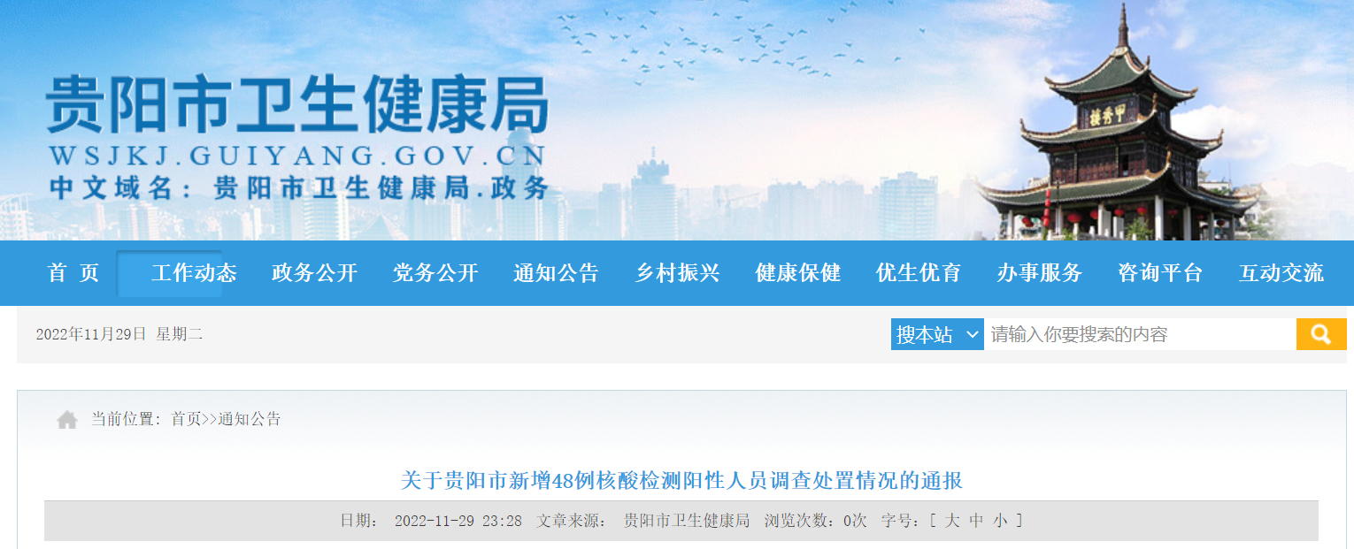 2022年11月29日,贵阳市发现48名核酸检测结果异常人员。接到报告后,党委政府高度重视,第一时间作出部署,果断采取处置措施。目前,流调溯源、核酸筛查、隔离观察、环境消杀等应急处置工作正有序开展。