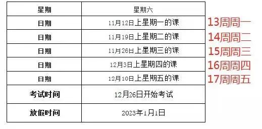 从第12周周末(11月12日)开始,连续5周星期六补课,2023年1月1日放假。