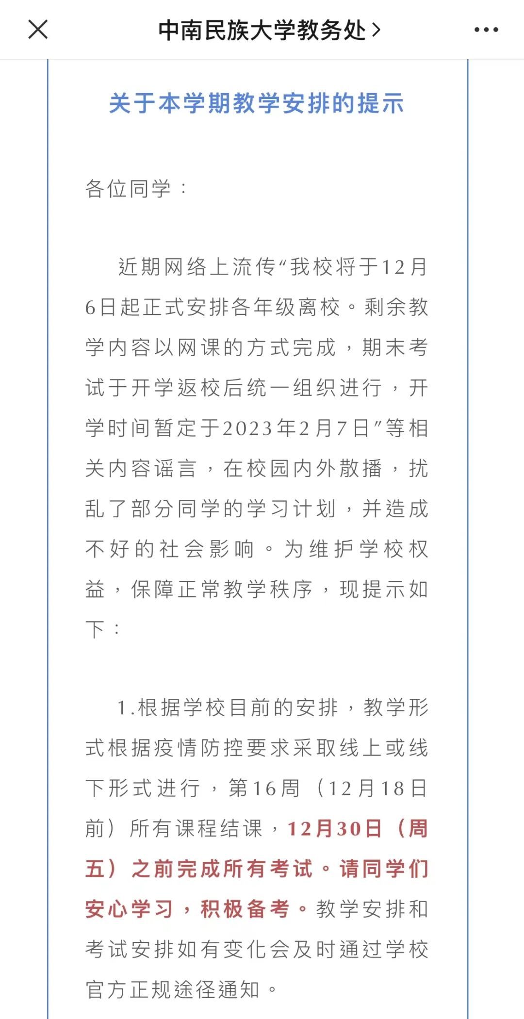 本学期教学周由原定的19个教学计划周,调整为18个教学计划周;各教学单位、各培养单位须在2022年12月30日(第18周周五)完成各项教学任务及课程考核;全体本科生和研究生于2022年12月31日前离校。