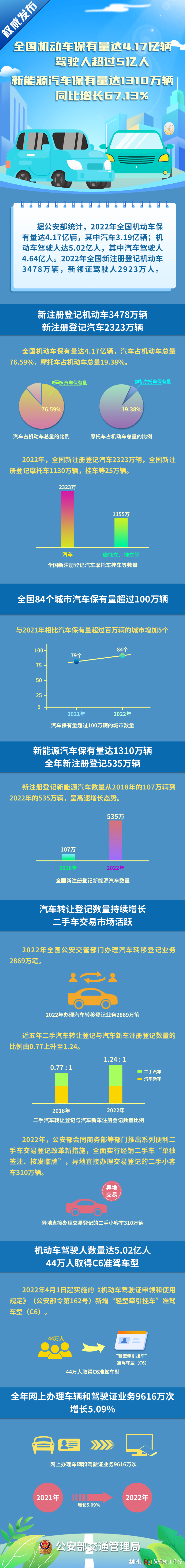 据公安部统计,2022年全国机动车保有量达4.17亿辆,其中汽车3.19亿辆;机动车驾驶人达5.02亿人,其中汽车驾驶人4.64亿人。2022年全国新注册登记机动车3478万辆,新领证驾驶人2923万人。