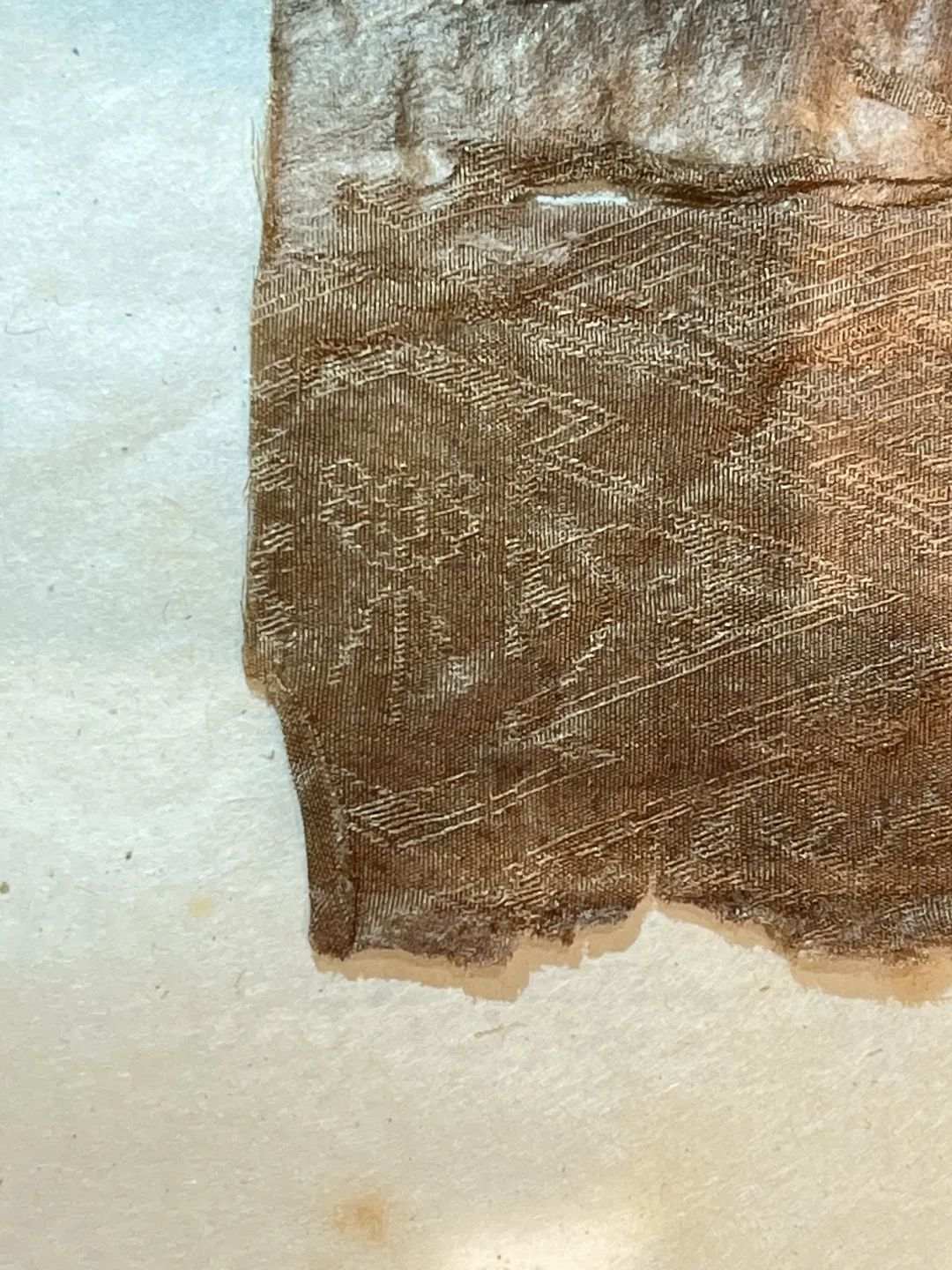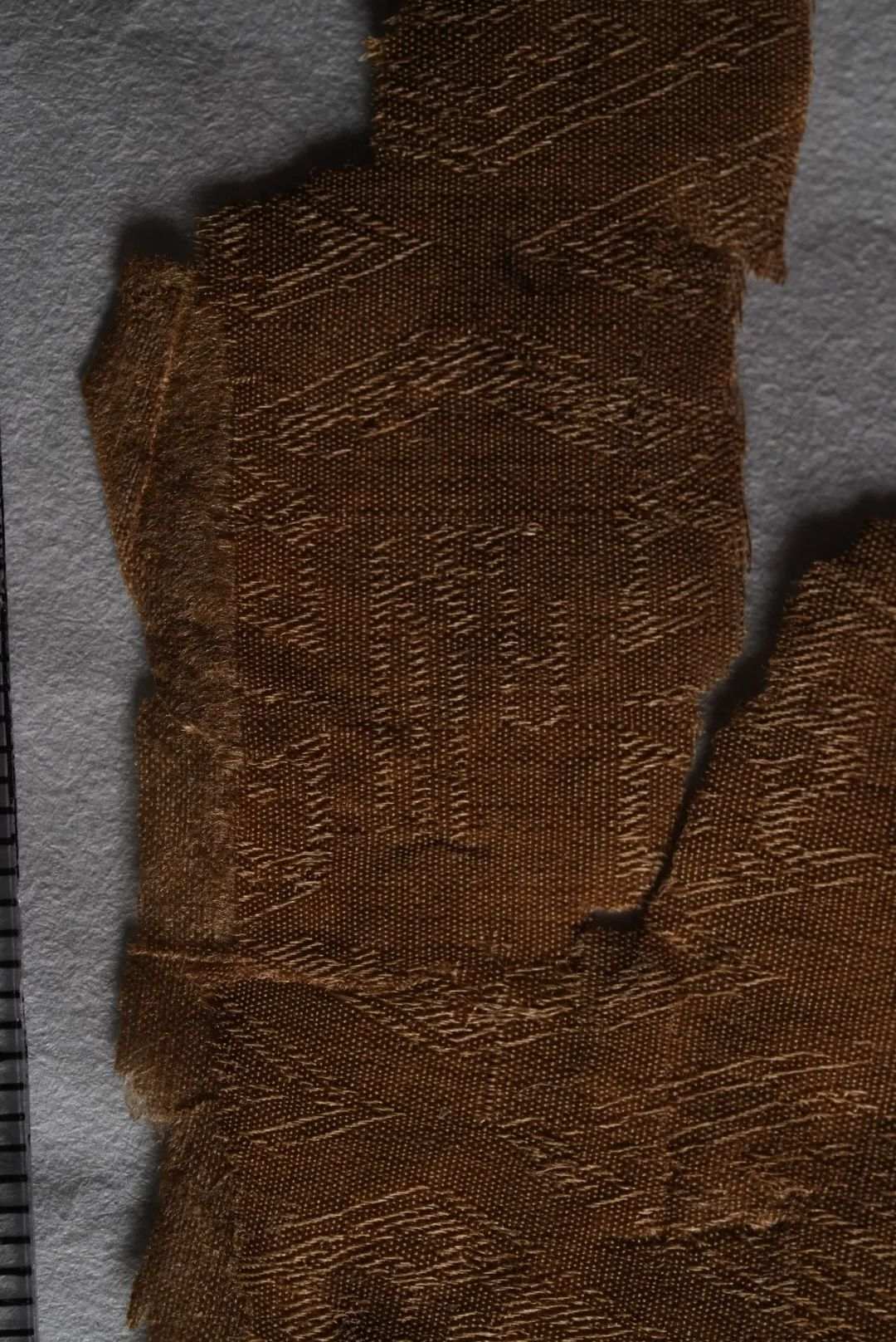 据介绍,马王堆三号墓主人是“辛追夫人”儿子利豨的墓葬,由于密封不严、渗水严重,发掘时不少文物保存得并不完好。其中,褐色菱纹绮丝绵袍是被折叠放在标注有“裞衣两笥”的竹箱子中,出土时已破碎成块,并和箱子中的其他纺织品粘连成堆。
