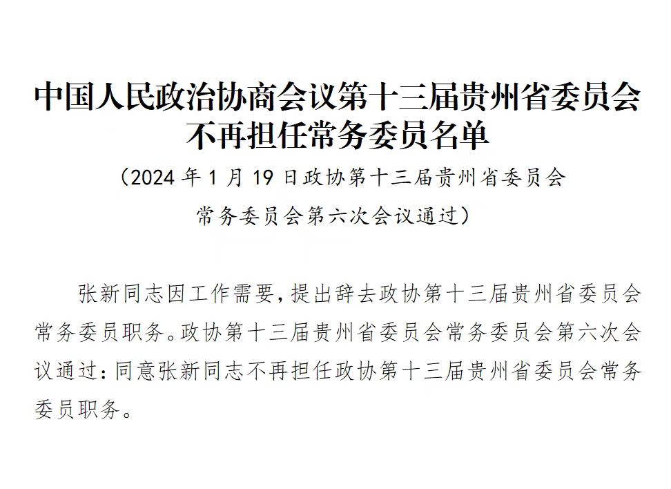 会议审议通过了《中国人民政治协商会议第十三届贵州省委员会委员增补名单》《中国人民政治协商会议第十三届贵州省委员会不再担任常务委员名单》《关于接受王松青等同志请辞政协第十三届贵州省委员会委员的决定》,共有32人增补为政协第十三届贵州省委员会委员,1人提出辞去政协第十三届贵州省委员会常务委员职务,7人请求辞去政协第十三届贵州省委员会委员。