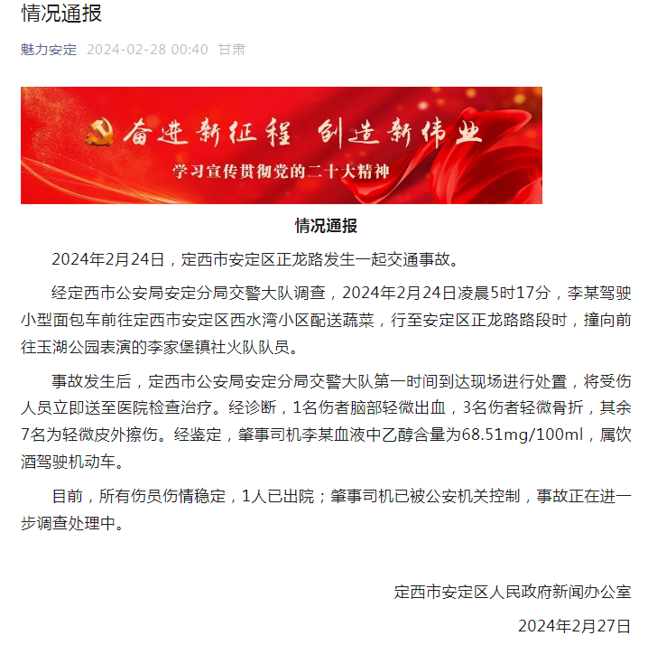 经定西市公安局安定分局交警大队调查,2024年2月24日凌晨5时17分,李某驾驶小型面包车前往定西市安定区西水湾小区配送蔬菜,行至安定区正龙路路段时,撞向前往玉湖公园表演的李家堡镇社火队队员。