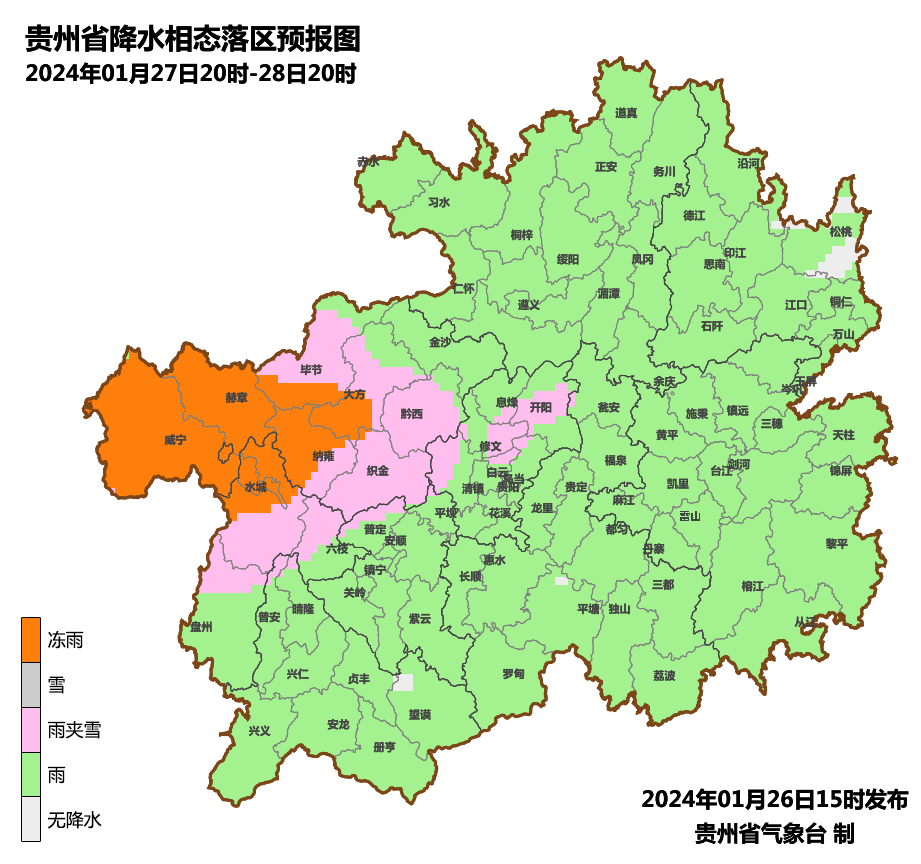 今天夜间到27日白天,省的中西部地区阴天夜间到早晨有小雨,西北部和中部地势高处有冻雨或雨夹雪并伴有道路结冰,其余地区阴天,全省大部地区最高气温回升至2~8℃;