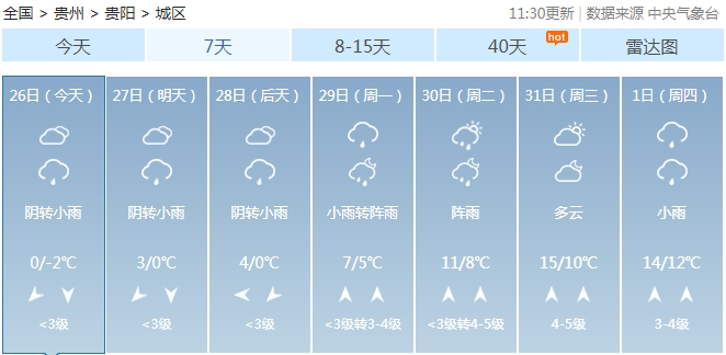 27日夜间到28日白天,全省阴天有小雨,西北部和中部地势高处夜间有冻雨或雨夹雪并伴有道路结冰,最低气温为-2~0℃,其余大部地区最低气温回升至0℃以上;