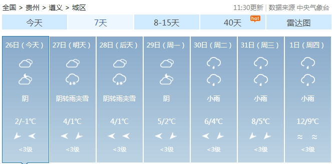 27日夜间到28日白天,阴天有小雨,夜间到早晨地势高处有冻雨或雨夹雪并伴有道路结冰;