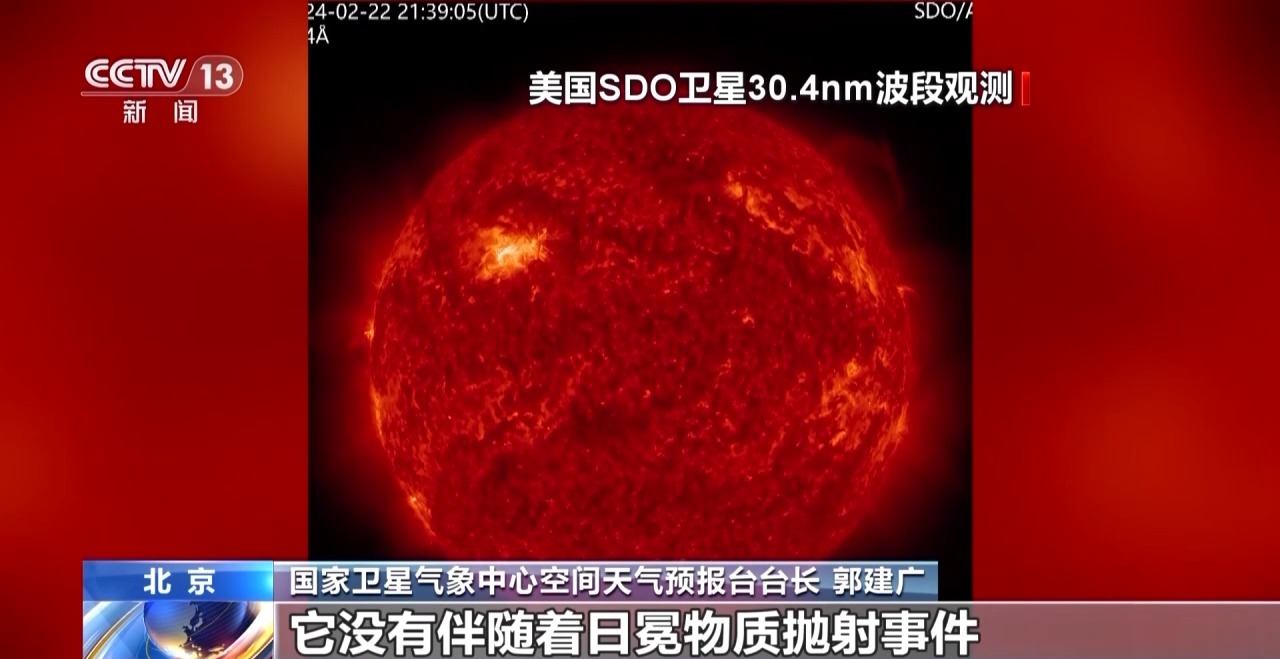 国家卫星气象中心空间天气预报台台长 郭建广:太阳耀斑我们一般是指(太阳)大气层中突然增亮的现象,一般它也伴随着大量的能量释放,这个能量大概相当于几千亿颗氢弹同时爆炸的能量。
