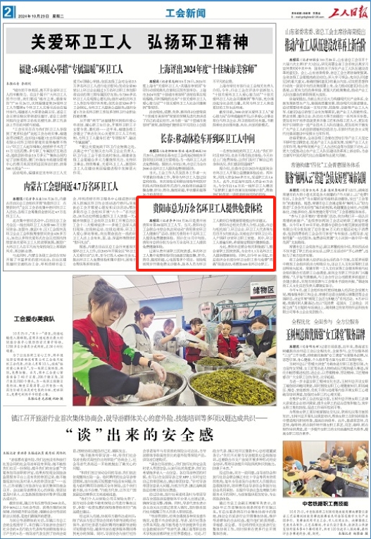 为此,贵阳市总联合相关职能部门,整合省职工医院资源,为全市1.1万名环卫工人提供健康体检。同时,自今年10月起,市总组织全市部分环卫女职工参与免费“两癌”筛查活动,将惠及600名环卫女职工。