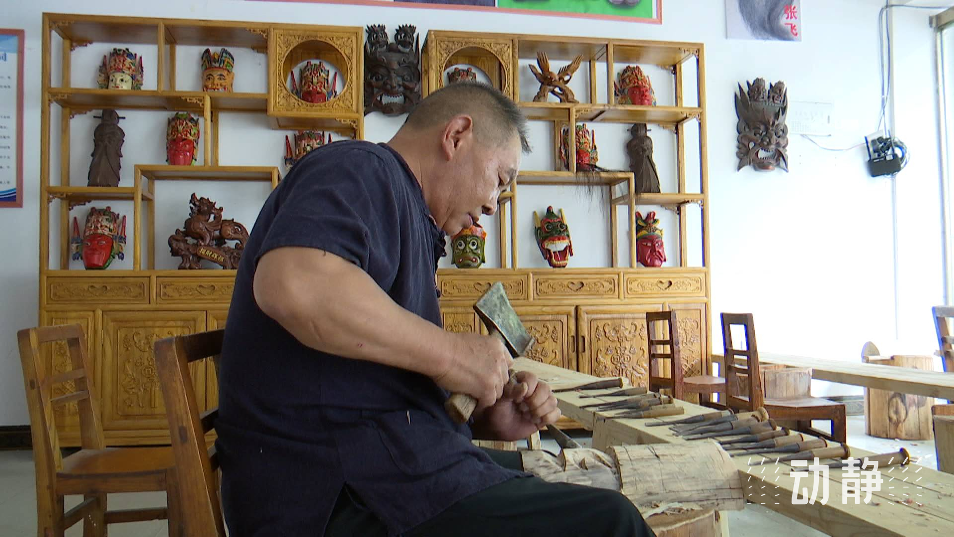 作为安顺地戏表演的重要道具,在唱戏人咿咿呀呀的唱腔中,那些或神秘或粗犷或怪诞的木雕面具既有着历史故事的传承,又凝聚着木雕艺人匠心独运的心血。杨正洪是安顺木雕贵州省级代表性传承人,他以木为纸,以刀为墨,书写传统技艺的“指尖魅力”。