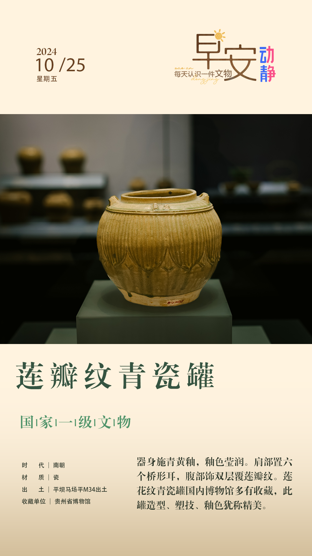 1956年平坝马场万人坟出土的东晋青瓷莲花罐,口径14.4厘米,腹径22.2厘米,通高20.5厘米,底径15厘米,造型优美,塑工精湛生动。随着佛教的传入,作为佛教文化中的重要文化象征的莲花,以纹饰形式出现在我国瓷器上面,则首见于六朝青瓷。此件莲花罐系耳下为凸弦纹二道,弦纹下紧接为堆塑双层倒垂莲花瓣,每层十一瓣,花瓣直垂腹下,莲瓣边缘凸起,莲瓣尖端略微上卷。堆塑莲花瓣纹与器形巧妙地融为一体,既美观又适用。