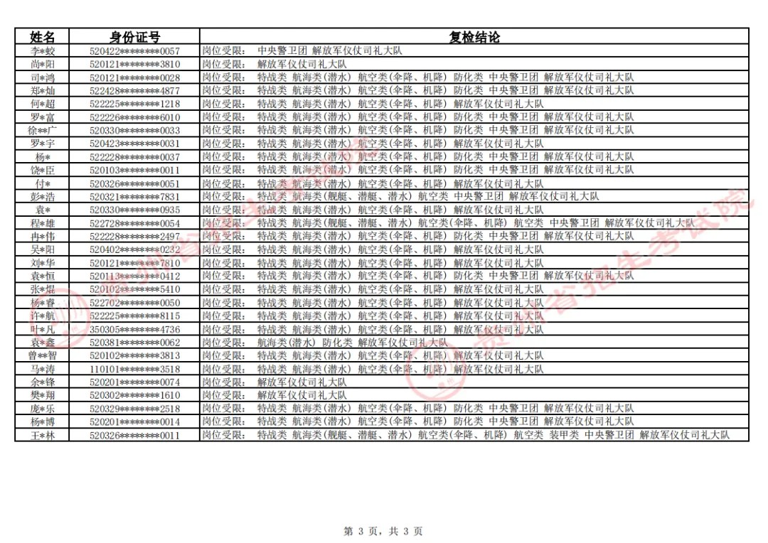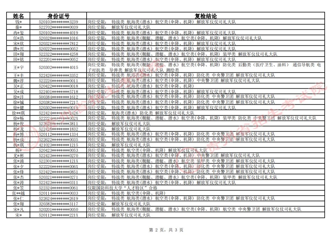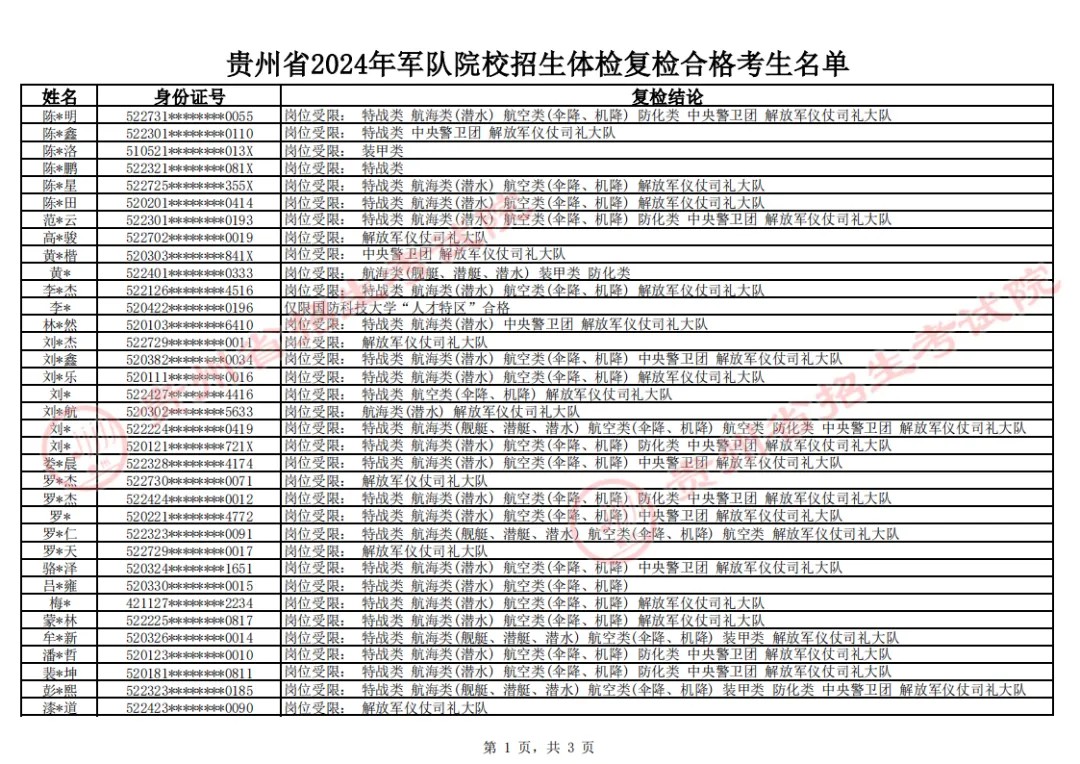 根据贵州省人民政府征兵办公室、贵州省招生考试院《关于做好2024年军队院校招收普通高中毕业生工作的通知》,现公布今年参加军队院校招生体检复检合格考生名单(101人),具体名单见下图。