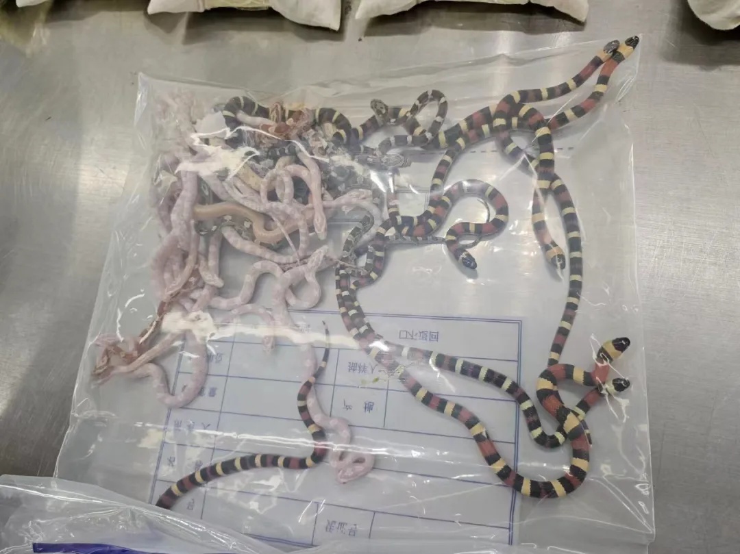日前,一名男性旅客经福田口岸旅检大厅“无申报通道”进境,被海关关员拦截检查。经查,海关关员发现该旅客所穿裤子口袋内装有使用胶带密封的束绳帆布袋6个,拆开后发现每个袋内均装有多条色彩斑斓、形态各异的活体蛇。经清点,共计104条。