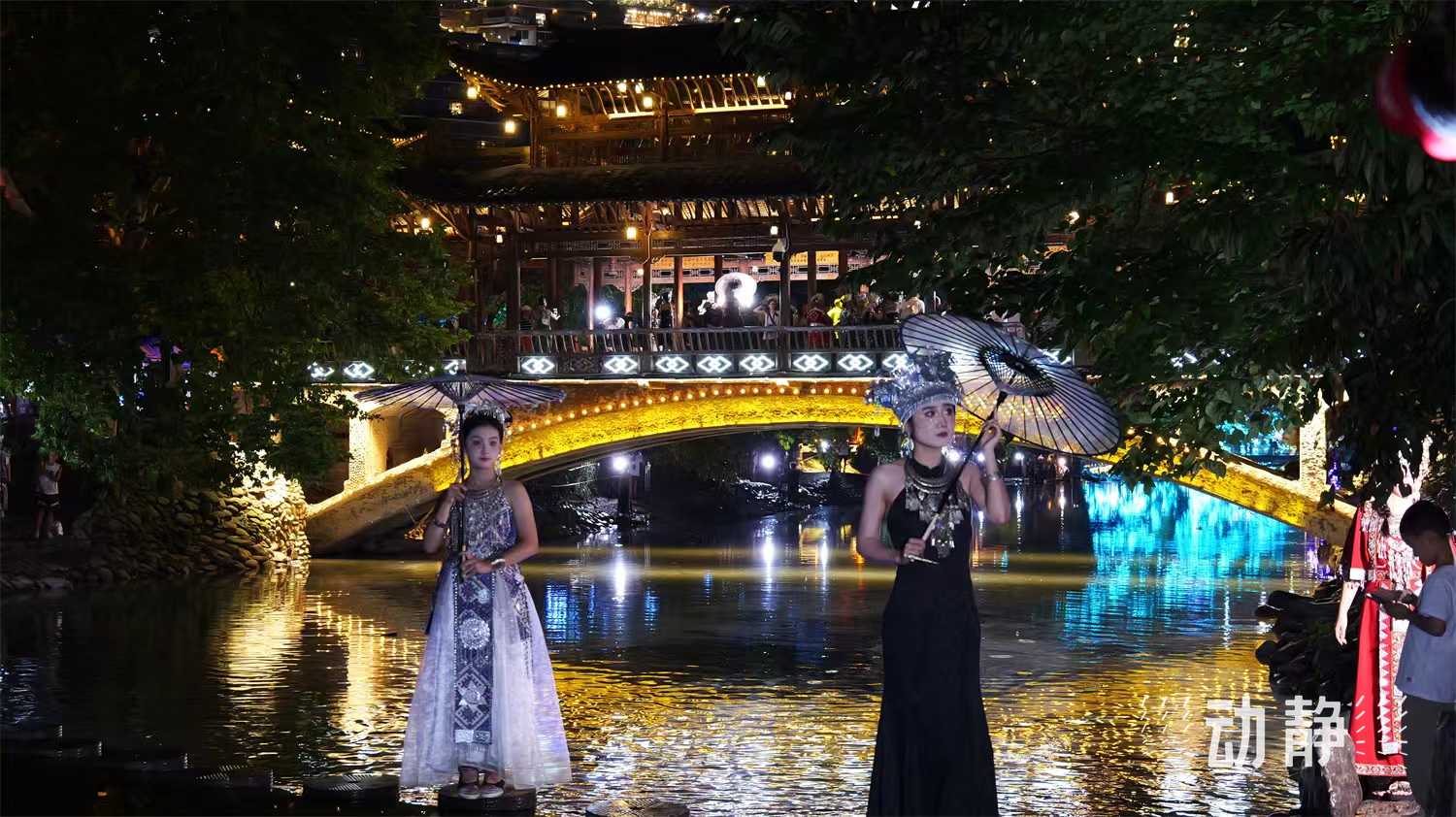 夜幕降临,大型苗族风情晚会“美丽西江”激情上映,“阿哥”“阿妹”们热情飞舞,游客享受着清凉贵州的魅力。白水河畔倒映着吊脚楼的倩影,更让无数的游客为之着迷。