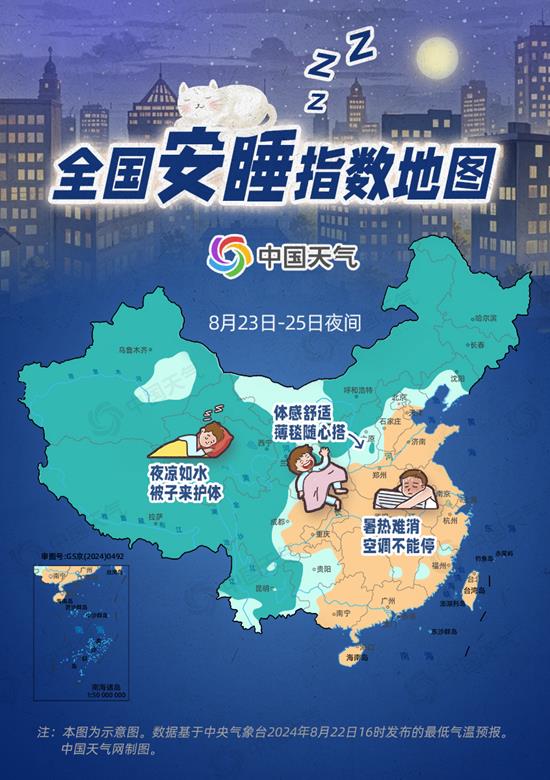 眼下,处暑节气已至,我国大部热力降级,但不少地方依然暑热未消。从中国天气网推出的全国安睡指数地图来看,未来三天,我国南北方夜晚体感大不同,黄淮、江淮及华南等地暑热依旧,西北地区、东北大部、西南地区等地凉意明显,最舒适的是内蒙古中部、华北北部及贵州等地。