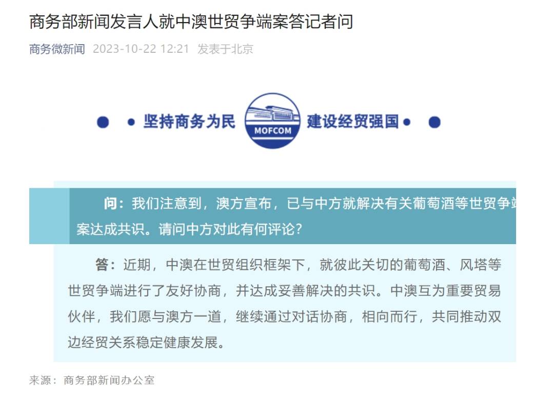 问:我们注意到,澳方宣布,已与中方就解决有关葡萄酒等世贸争端案达成共识。请问中方对此有何评论?